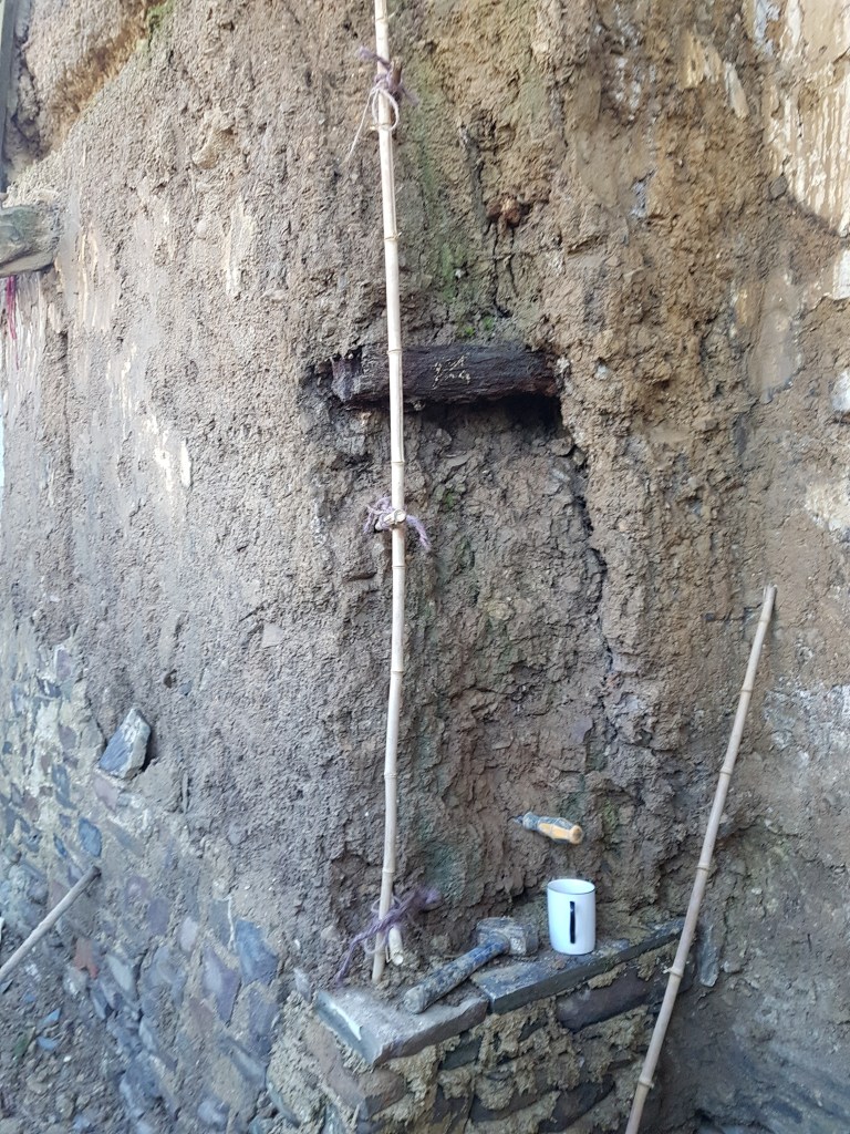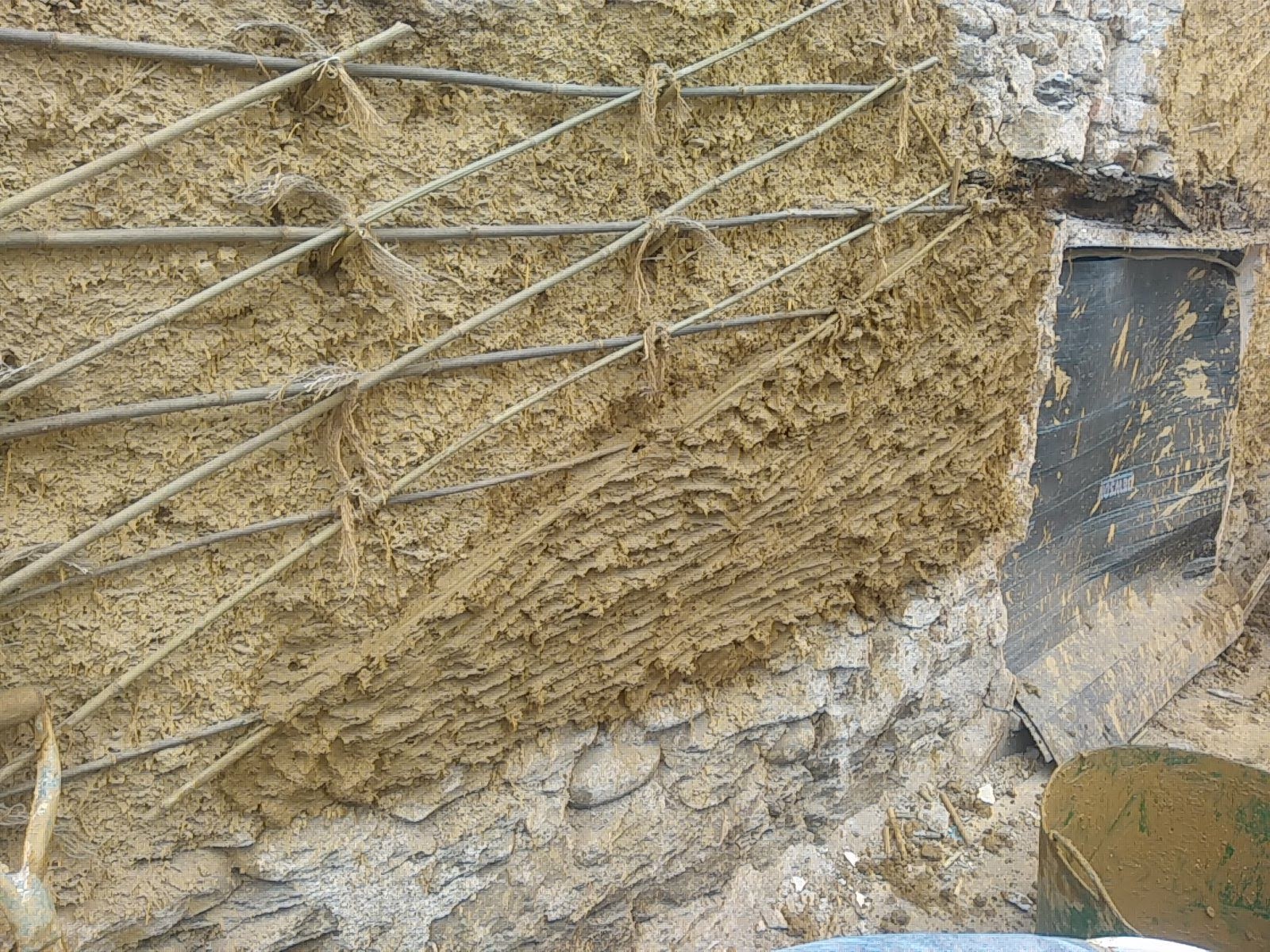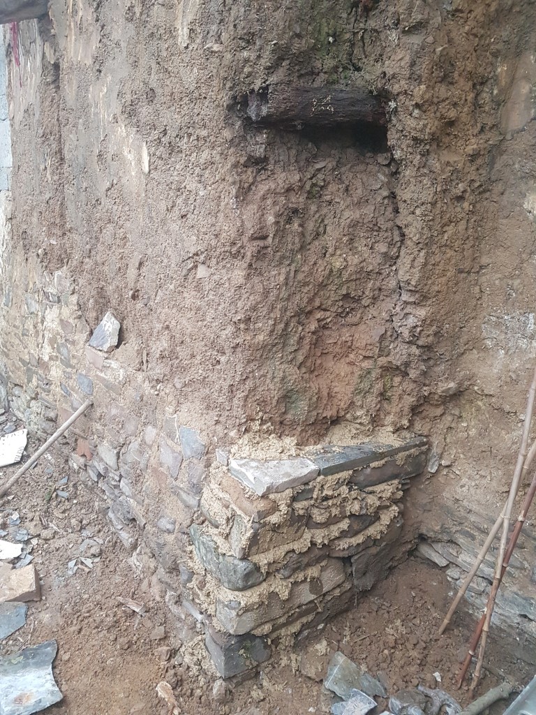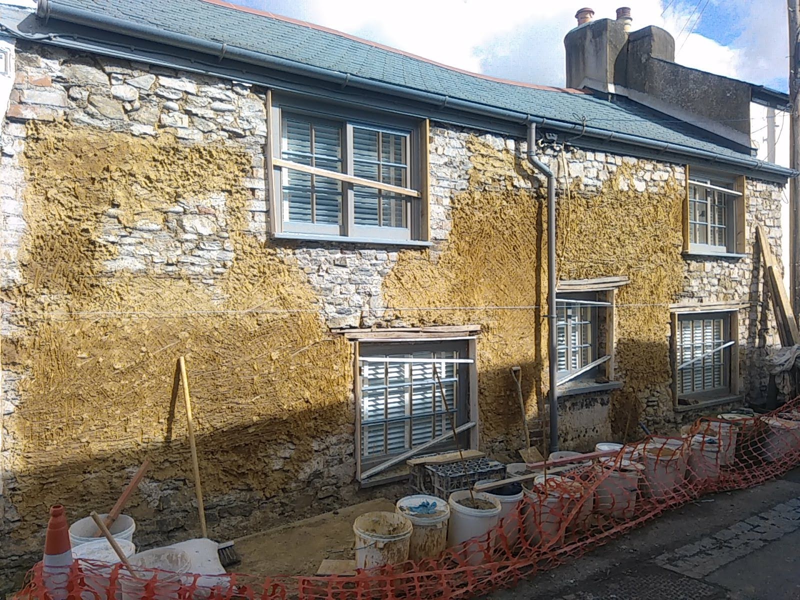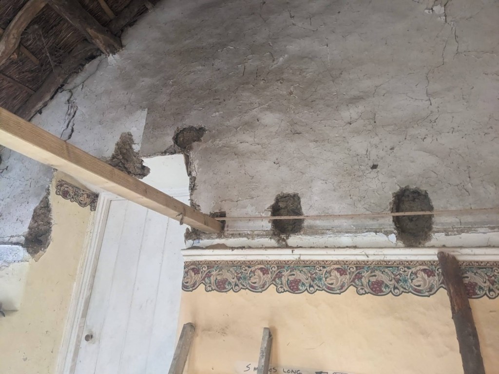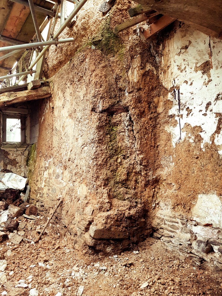 the cottage is built of stone and cob with lime and earth plasters that had been patched with gypsum, cement and lime at different periods. There are sections that have limewash on cob with lime plaster on top of that and then gypsum plaster on top of that. Planty of the plaster was loose and crumbling but the majority was sound and the customer wanted to keep the costs down by repairing the plaster rather than replacing it.