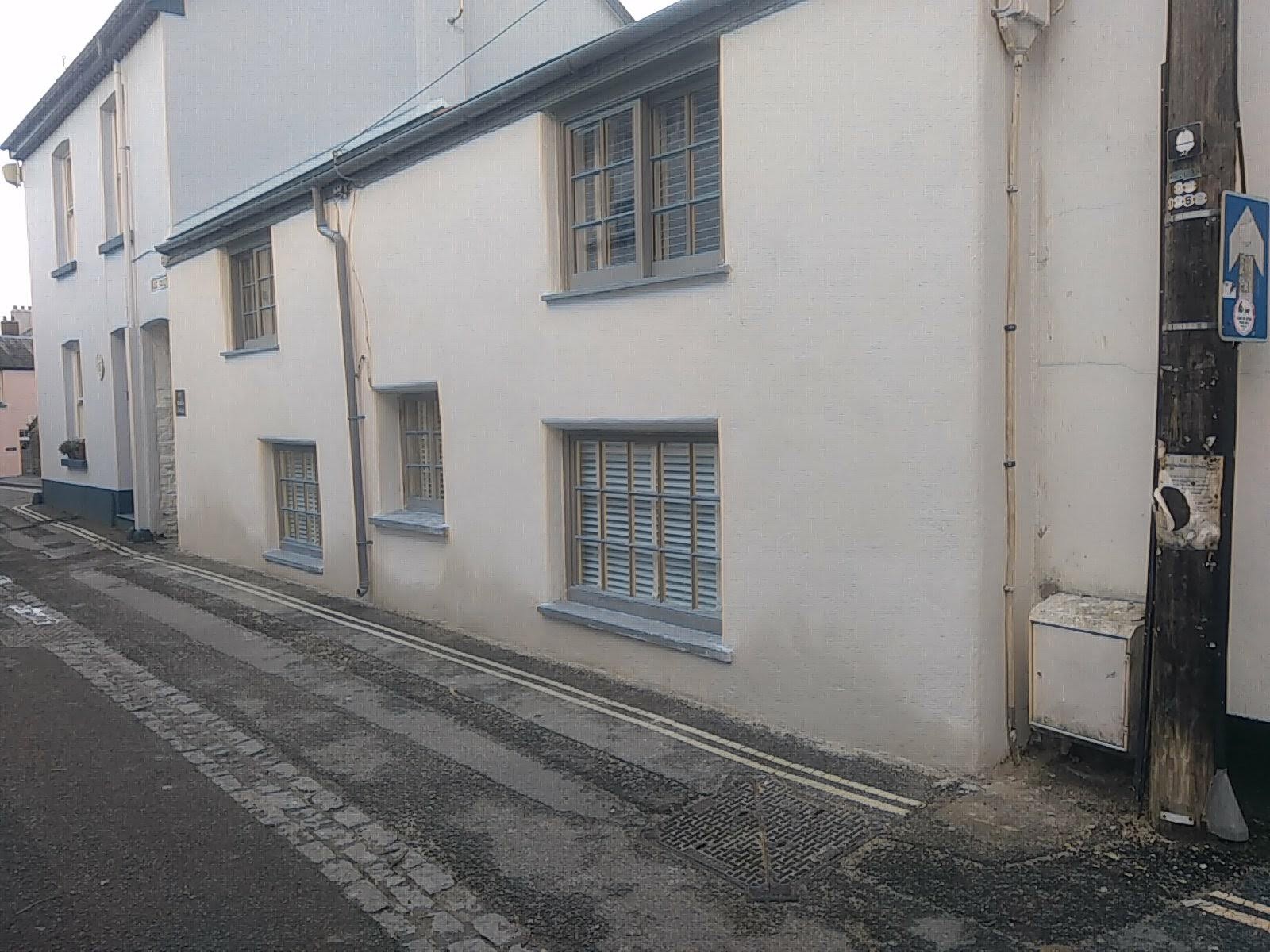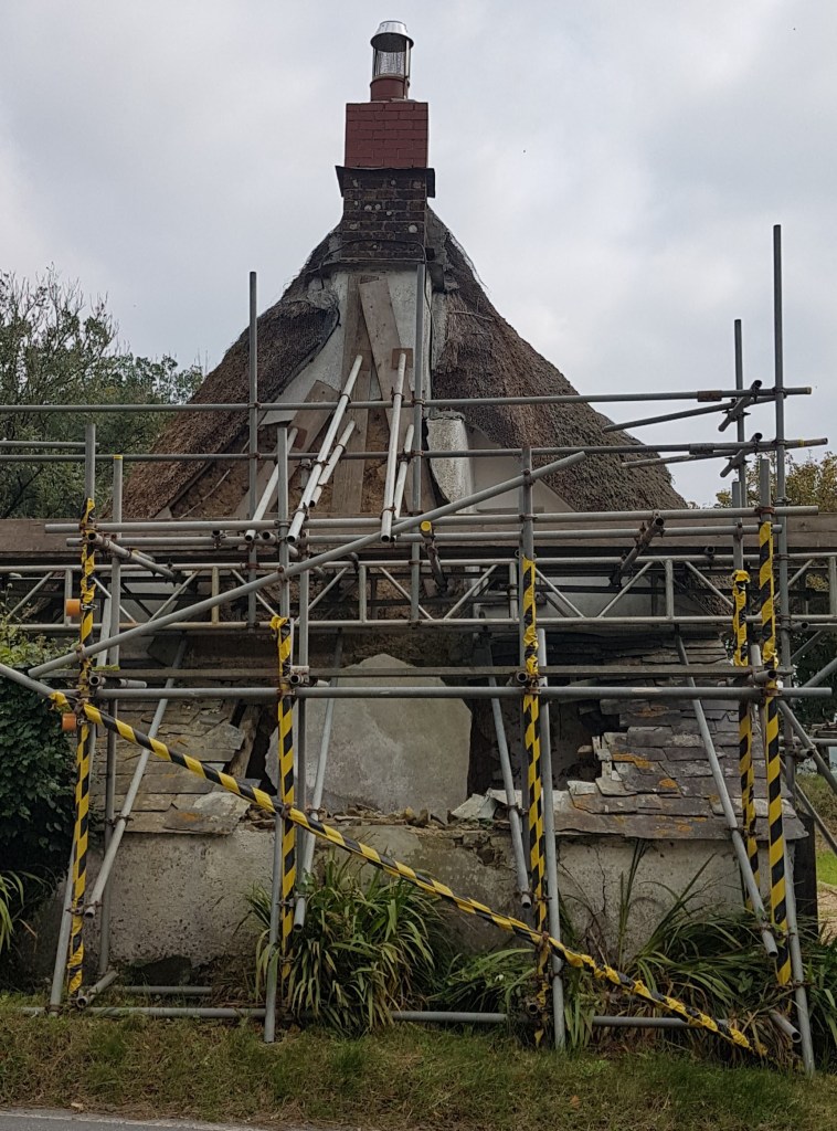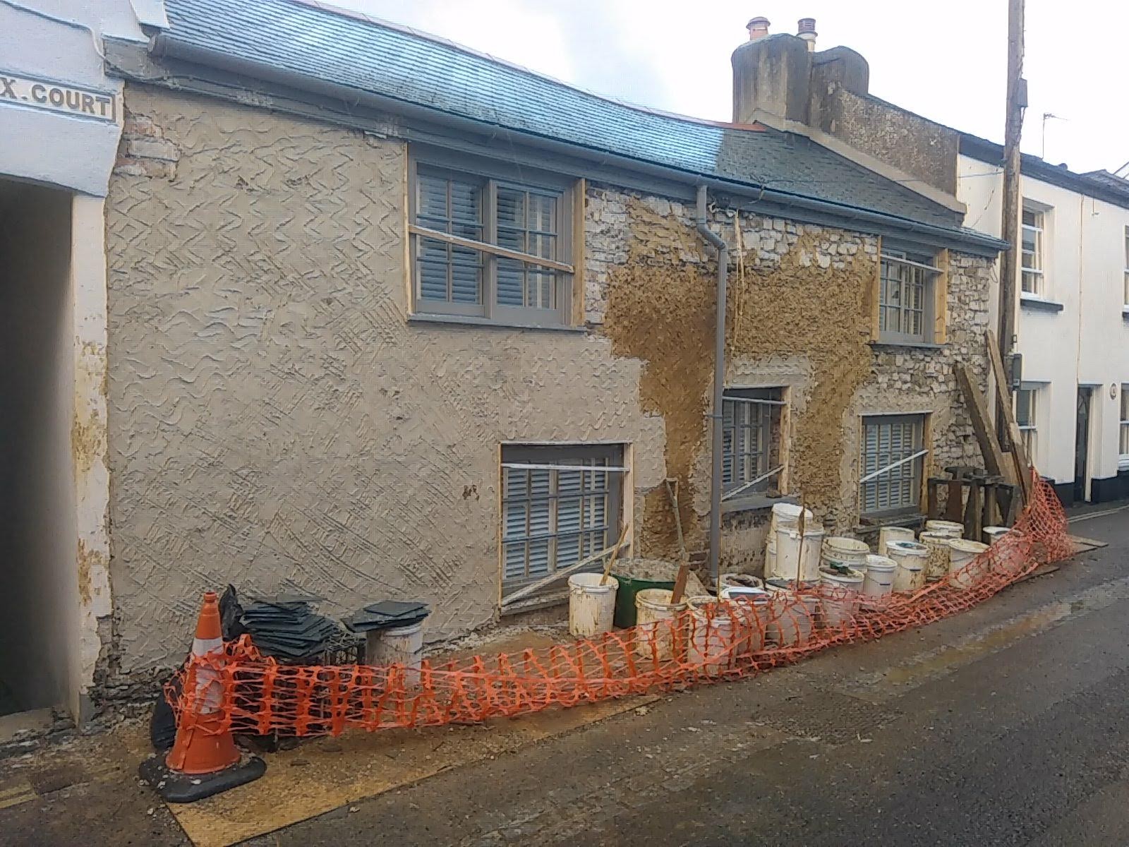 A small cob cottage with a big problem. Overly thick cement render on a cob gable wall. A large piece of the render had fallen off and gone through the lean to shed roof. The cottage had stood empty for quite a few months.