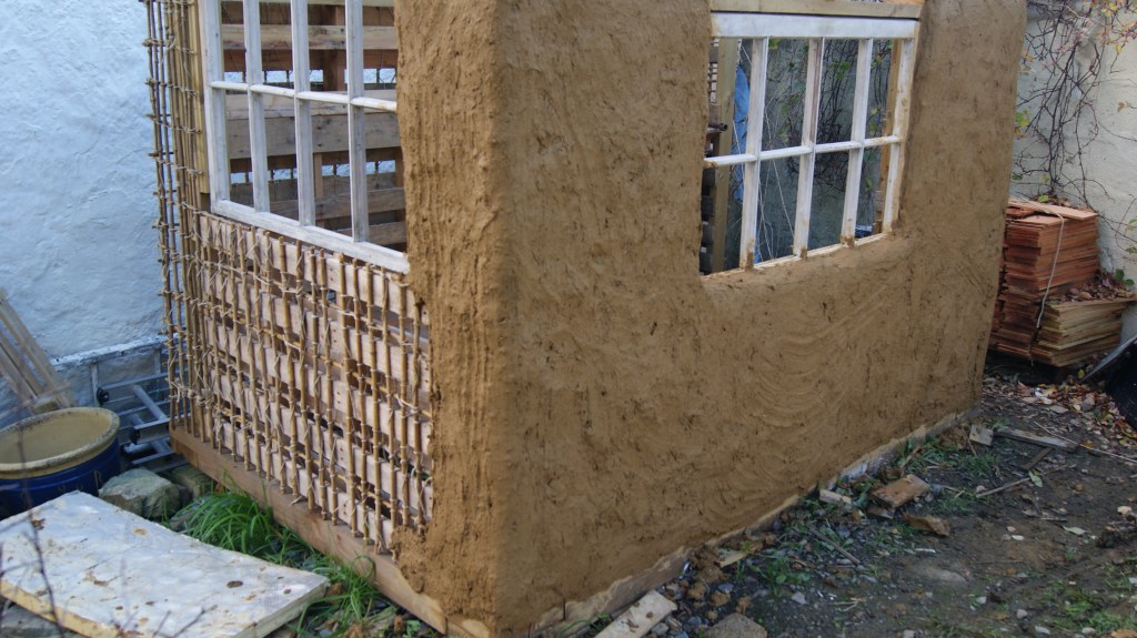 I decided to build a shed from old pallets and I decided to render it with cob – earth, stones and straw – so it would be in keeping with our cottage.