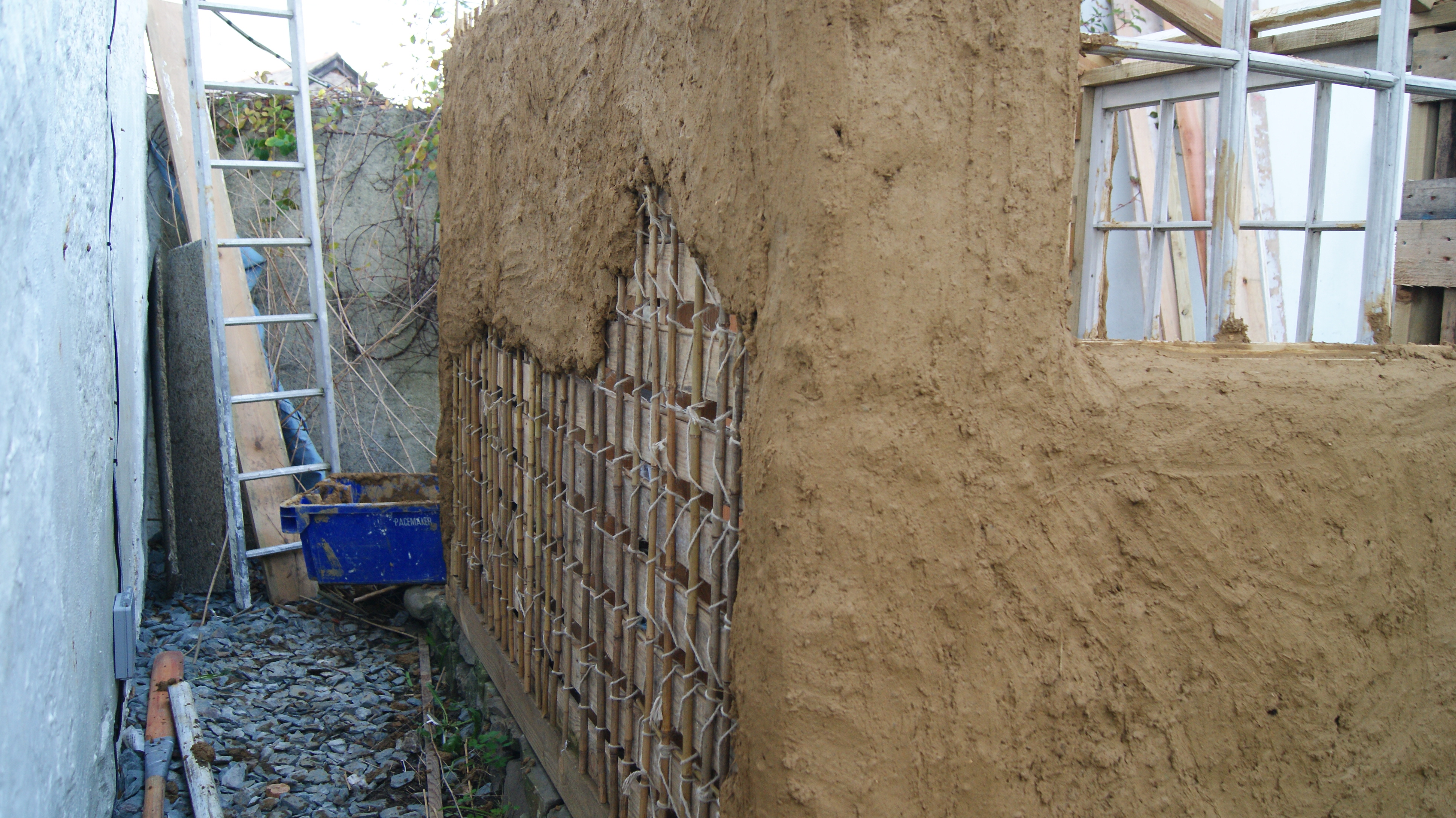 Eventually the cob will be covered with lime roughcast and limewashed white to match the cottage.