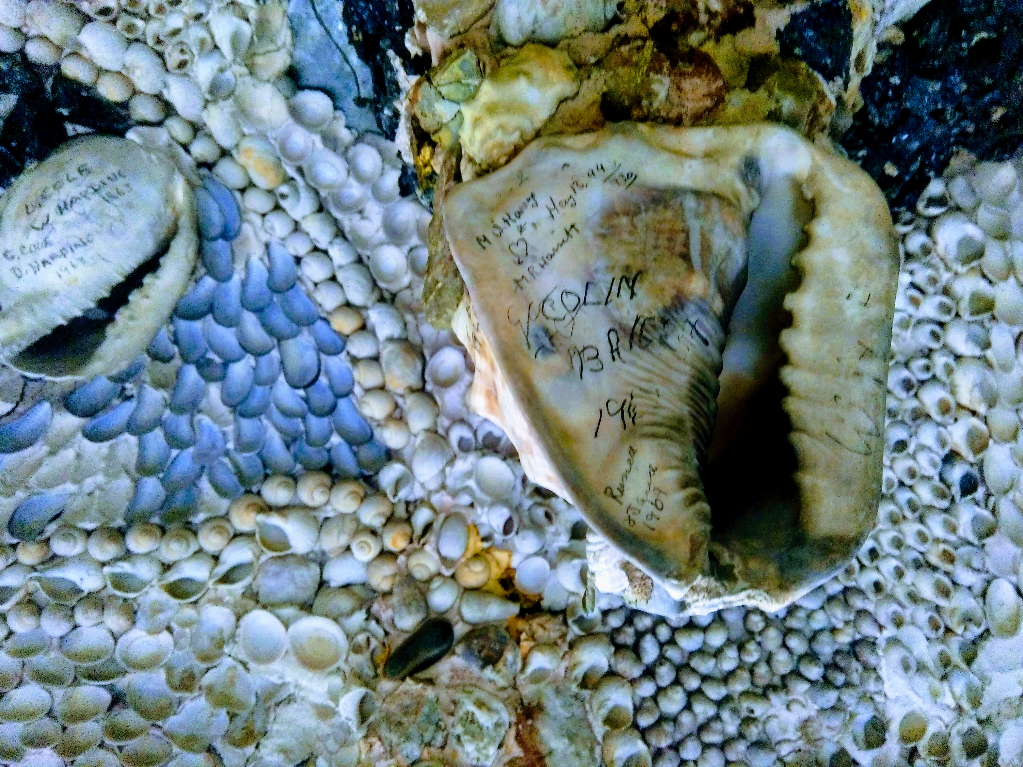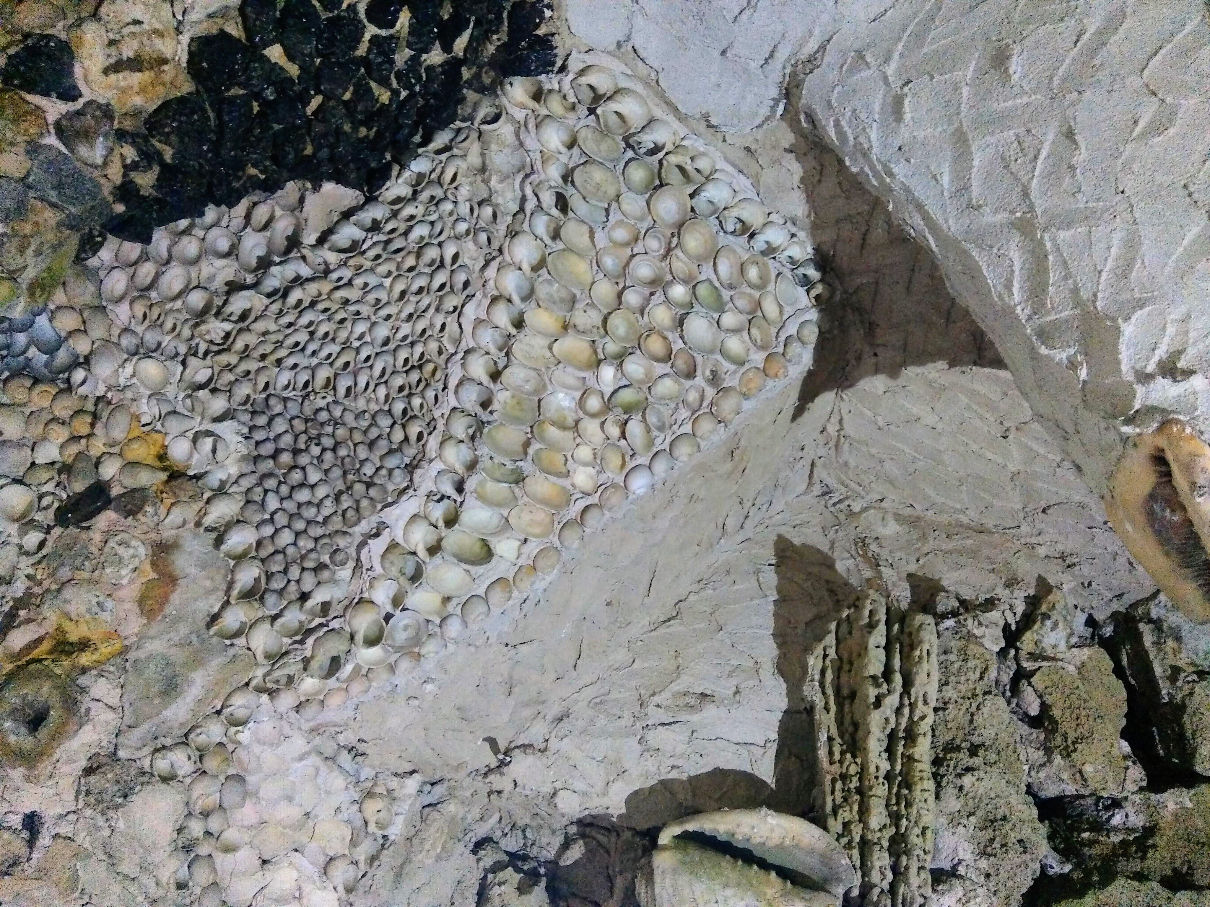 All the shells were rescued from the fallen plaster and reused. The pattern of shell mosaic appeared to follow a regular style, with the different shells – cockles, mussels, whelks, periwinkles, oysters and limpets – all used in the same way throughout the existing undamaged ceiling, all I did was create my own interpretation following the existing pattern.