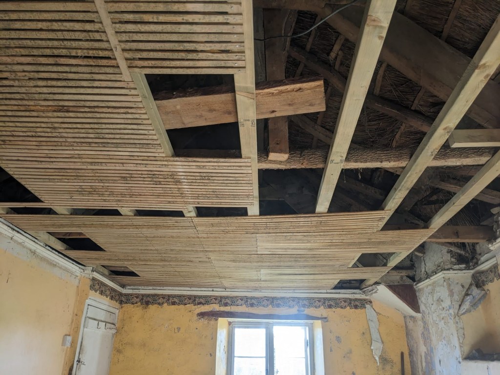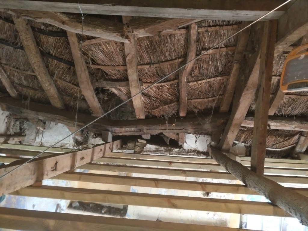 The project was to replace a collapsing lath and plaster ceiling. The plaster was earth and lime with inclusions of animal hair. The laths were worm eaten as were the rather thin joists, two inch square wood which could be easily snapped in half. There was a prominent sag in one of the cross beams and one of the purlins was broken and was propped with a thin tree branch, many of the timbers still had the bark on.