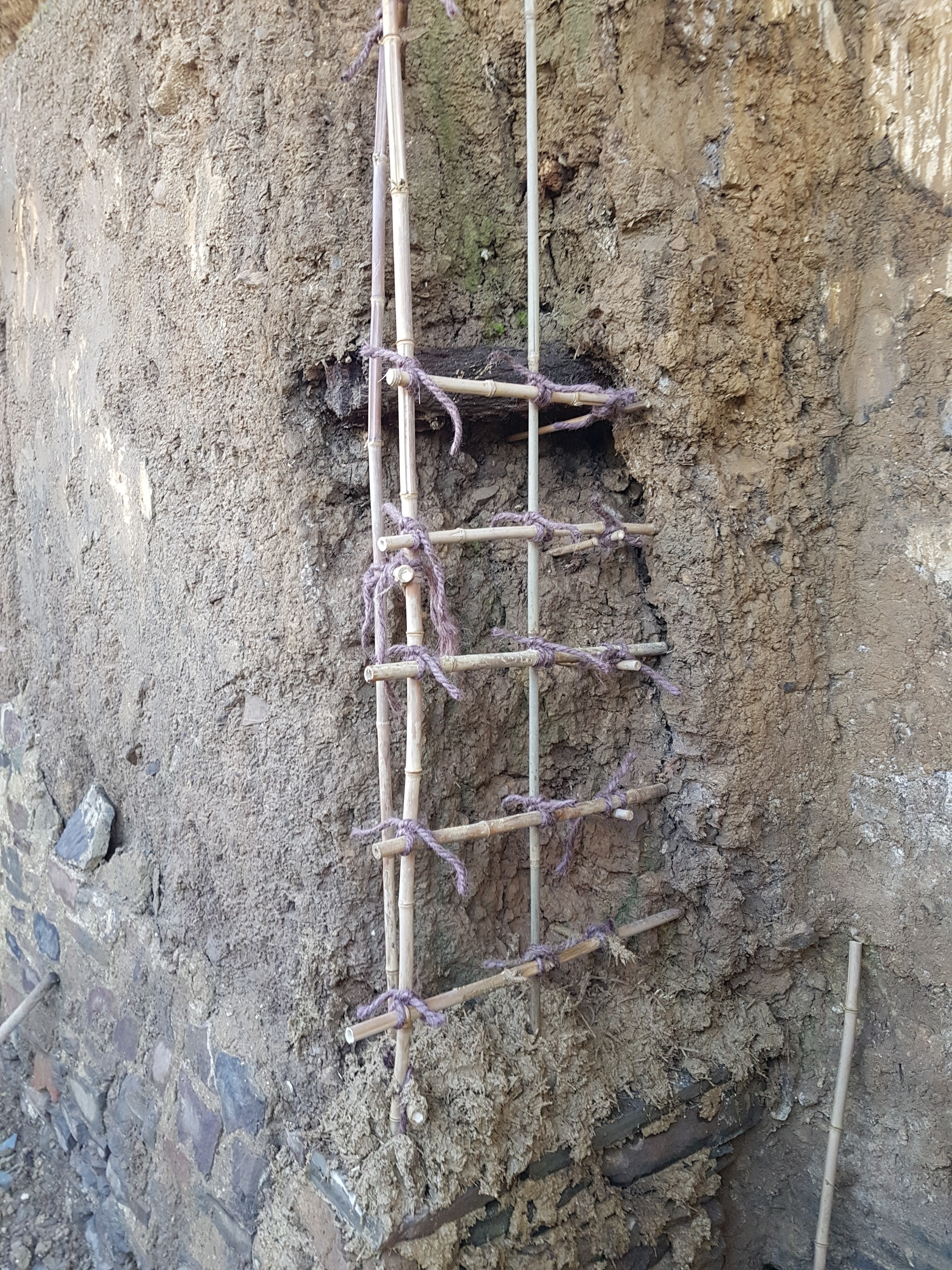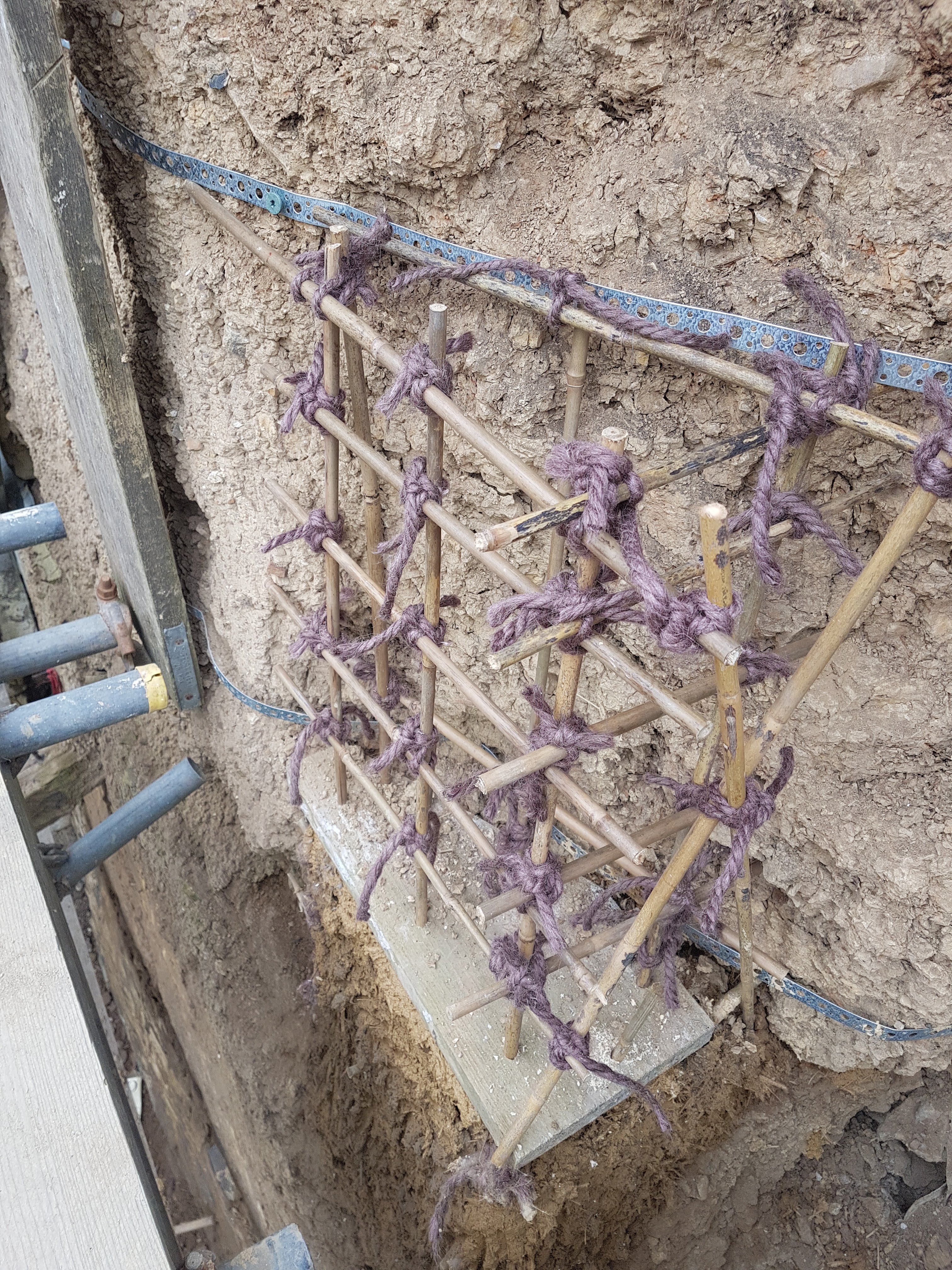 To help fix the cob to the pallets I fixed bamboo canes vertically and rather than nails I tied them on with hemp rope. All very Japanese in influence and all good fun.