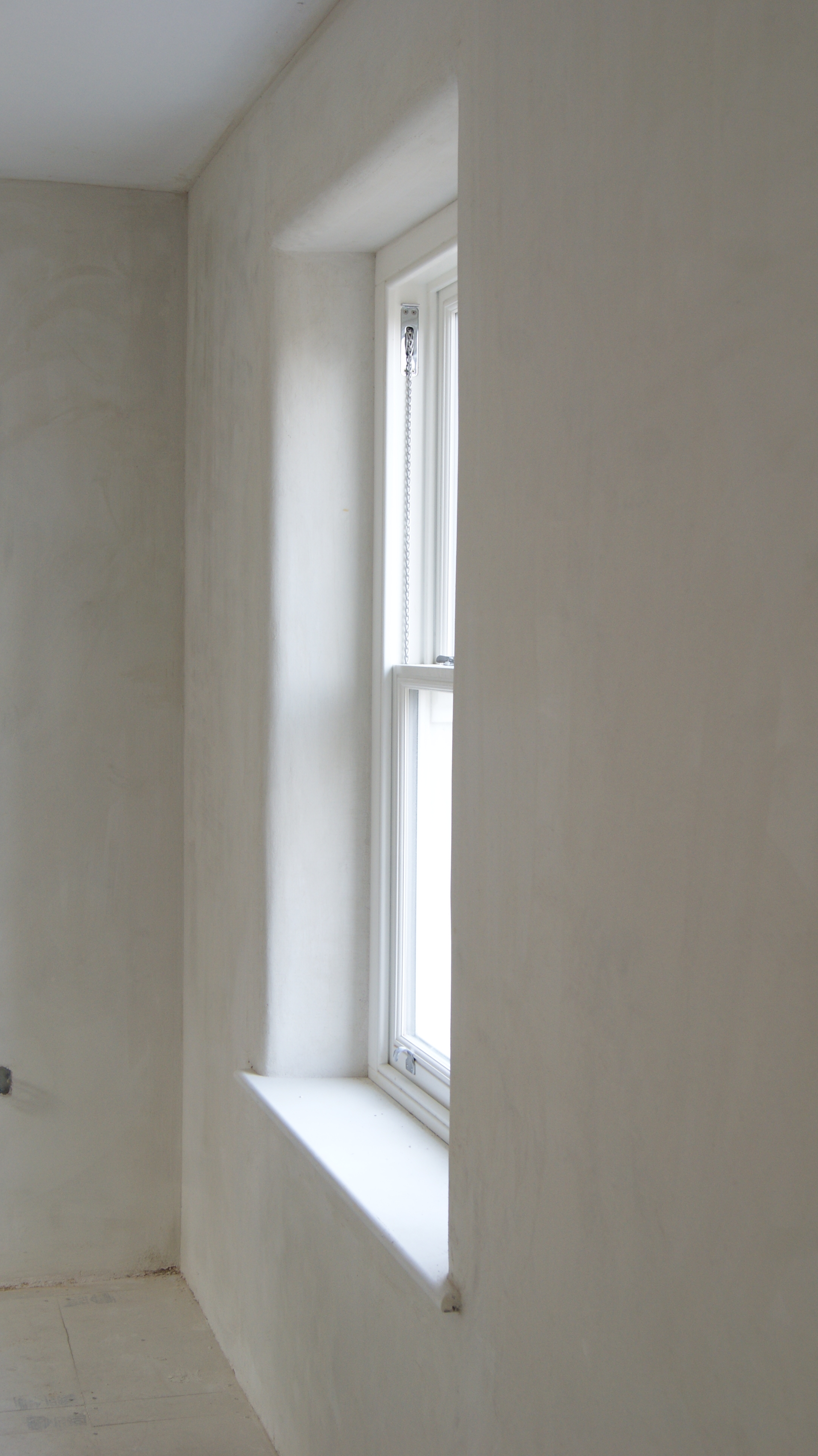 The same plasters were used on all the surfaces with the occasional modification: for instance on the woodwool board ceiling I added loads of short horse hair to the finestuff, an idea taken from the Chalklime I had been using elsewhere, loads of hair mixed with fine lime rich plaster – a joy to use, spreads beautifully and cracks not a jot*, two coats on the boards, hair in both coats, trowelled smooth and flat.