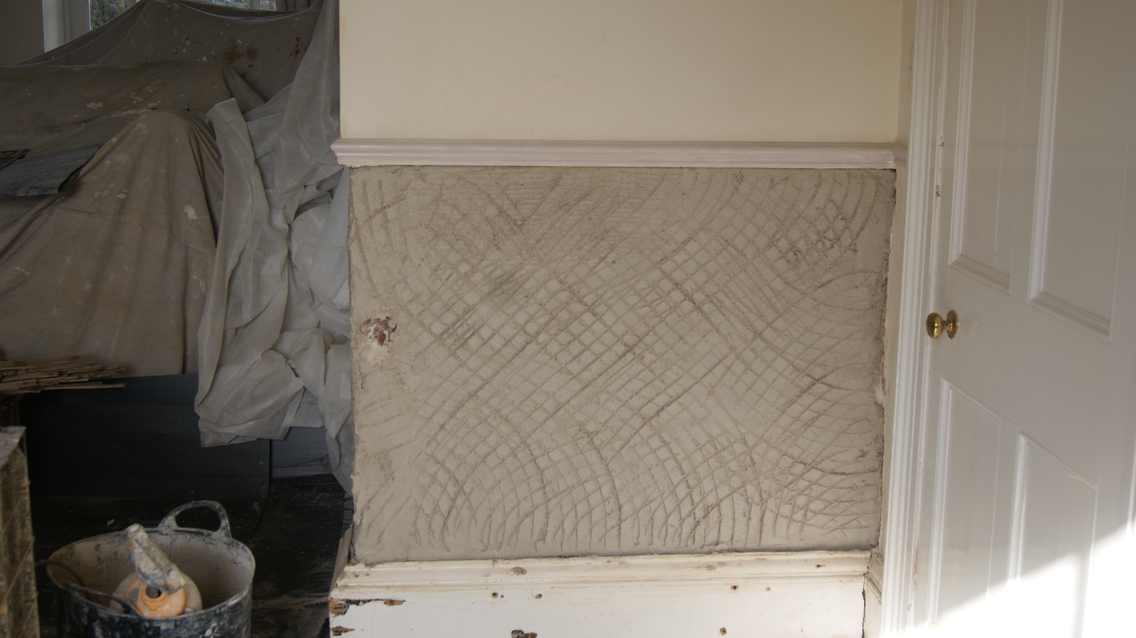 Another penny dropped the other week when I saw a scratch coat of render that hadn’t rendered the wall flat, it was almost as bumpy as before. there is no point in this, if you are after a flat wall the scratch coat is the time to get it flat – dub it out to even out the surface, apply the first coat, get that as flat as possible and any undue thickness, due to the undulating surface might well crack a little, even with plenty hair, but this cracking is in the first coat and as long as the plaster hasn’t become detached from the wall (which can happen) it is of little consequence. Once you get it flat, and you can use a straight edge such as a rule, or derby float for this, then you scratch it ready for the next coat.