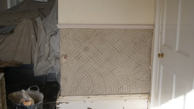 Once you have a really sticky plaster the technique of plastering changes – you don’t really spread it on directly off the hawk but apply it to the wall in dollops and then spread it flat, it’s amazing how easy the process of plastering becomes when the mix is right (and how difficult the job is when the mix is wrong).